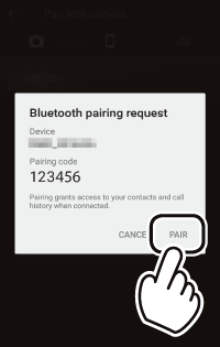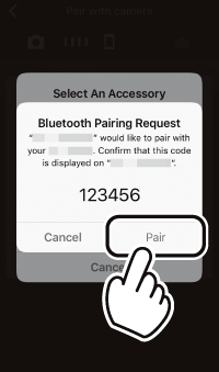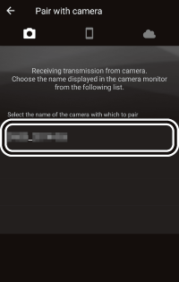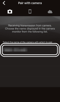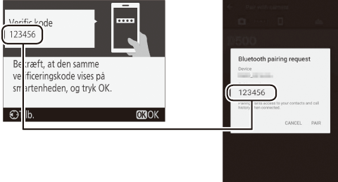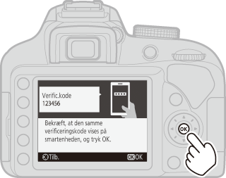 Smartenhed: Tryk på kameraets navn.  Kameraets navn vises ikke SnapBridge viser muligvis ikke kameranavnet, hvis der startes, før kameraet viser anmodningen om start (trin 1). Afslut SnapBridge, og bekræft, at den ikke kører i baggrunden (proceduren varierer med smartenheden; se dokumentationen, der leveres med din enhed, for detaljer), før du trykker på ikonet SnapBridge for at starte SnapBridge igen. Kamera/smartenhed: Bekræft, at kamera og smartenhed viser samme kode for godkendelse (der er sat en cirkel rundt om koden i illustrationerne nedenfor).  Kamera/smartenhed: Påbegynd sammenkædningen. - Kamera: Tryk på J.