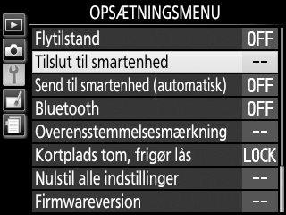 Sammenkædning for første gang Efter endt sammenkædning for første gang ved hjælp af appʼen SnapBridge bliver du bedt om at vælge indstillinger for automatisk forbindelse (automatisk overførsel og automatisk synkronisering af ur og placering). Denne anmodning vises ikke igen, men du kan til hver en tid få adgang til indstillingerne for automatisk forbindelse ved hjælp af Auto link (Automatisk forbindelse) på fanen  . .Kamera/smartenhed: Følg instruktionerne på skærmen. Kamera: Tryk på J. Når sammenkædningen er fuldført, viser kameraet en meddelelse om, at kameraet og smartenheden er tilsluttet. Tryk på J, og følg instruktionerne på skærmen.  -