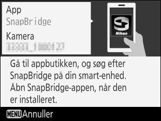 Søg efter "snapbridge" i Apple App Store® (iOS) eller på Google Play™ (Android™), og installér appʼen SnapBridge.  Du kan finde information om understøttede styresystemer på siden for download. Dette kamera er ikke kompatibelt med appʼen SnapBridge 360/170.
