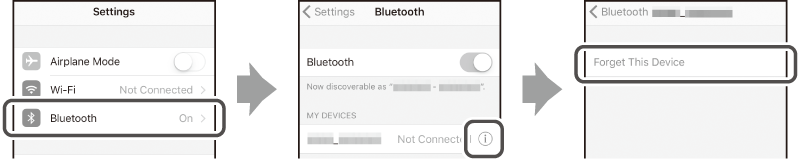 iOS-enhed: Afslut SnapBridge, og bekræft, at den ikke kører i baggrunden (for yderligere information, se "Kameraets navn vises ikke", 0 Kameraets navn vises ikke ). Derefter skal du åbne appʼen "Settings" (Indstillinger) i iOS og anmode iOS om at "glemme" kameraet (hvis relevant), før du vender tilbage til trin 1.