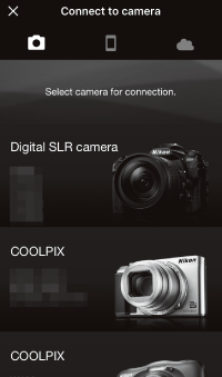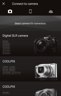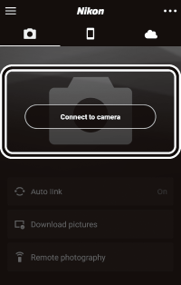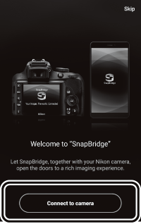 Smartenhed: Start SnapBridge på smartenheden, og tryk på Connect to camera (Tilslut til kamera).  Sammenkædning efter start Hvis du trykkede Skip (Spring over) i øverste højre hjørne af velkomstdialogboksen for at springe sammenkædning over, da du startede appʼen SnapBridge for første gang, skal du trykke på Connect to camera (Tilslut til kamera) på  fanen og fortsætte til trin 3. fanen og fortsætte til trin 3. Start af SnapBridge tidligt Hvis du startede SnapBridge, før du bliver bedt om det af kameraet, leder SnapBridge dig hen til valg af kameratype i trin 2. Hvis du trykker på den ønskede kameratype, vises en dialogboks, hvor du bliver bedt om at få vist startanmodningen på kameraet; få vist startanmodningen, og fortsæt til trin 3.