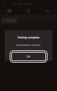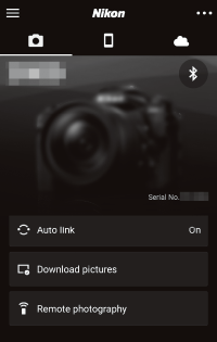 Sammenkædning for første gang Efter endt sammenkædning for første gang ved hjælp af appʼen SnapBridge bliver du bedt om at vælge indstillinger for automatisk forbindelse (automatisk overførsel og automatisk synkronisering af ur og placering). Denne anmodning vises ikke igen, men du kan til hver en tid få adgang til indstillingerne for automatisk forbindelse ved hjælp af Auto link (Automatisk forbindelse) på fanen  . .Kamera/iOS-enhed: Følg instruktionerne på skærmen. Kamera: Tryk på J. Når sammenkædningen er fuldført, viser kameraet en meddelelse om, at kameraet og smartenheden er tilsluttet. Tryk på J, og følg instruktionerne på skærmen.  -