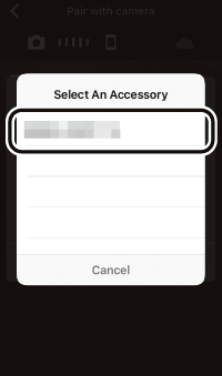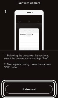 iOS-enhed: Tryk på kameraets navn.  Kameraets navn vises ikke SnapBridge viser muligvis ikke kameranavnet, hvis der startes, før kameraet viser anmodningen om start (trin 1). Afslut, og bekræft, at den ikke kører i baggrunden (hvis din enhed er udstyret med knappen Home, kan du gøre dette ved at dobbeltklikke på knappen Home og svirpe opad for at afvise SnapBridge; ellers skal du svirpe langsomt opad fra bunden af skærmen for at åbne vinduet Multitasking, derefter trykke på forhåndsvisningen af SnapBridge og holde den nede og trykke på ikonet  ). Når du har bekræftet, at appʼen SnapBridge ikke kører i baggrunden, skal du trykke på ikonet SnapBridge for at starte SnapBridge igen. ). Når du har bekræftet, at appʼen SnapBridge ikke kører i baggrunden, skal du trykke på ikonet SnapBridge for at starte SnapBridge igen.iOS-enhed: Der vises en dialogboks for bekræftelse; læs instruktionerne i sammenkædning grundigt igennem, og tryk på Understood (Forstået).  iOS-enhed: Tryk på kameraets navn, når du bliver bedt om det.  Kamera/iOS-enhed: Påbegynd sammenkædningen. - Kamera: Tryk på J.