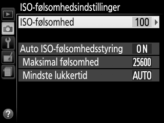 Denne indstilling er tilgængelig med objektiver af type E og G (0 Identifikation af CPU-, type G-, E- og D-objektiver), når kameraet er i indstillingerne P, S, A eller M. Hvis Fra er valgt, forbliver ISO-følsomheden fastsat ved den værdi, brugeren har valgt (0 ISO-følsomhed). Når Til er valgt, justeres ISO-følsomheden automatisk, hvis der ikke kan opnås optimal eksponering ved den værdi, som brugeren har valgt. Den maksimale værdi for auto ISO-følsomhed kan vælges ved hjælp af indstillingen Maksimal følsomhed i menuen Auto ISO-følsomhedsstyring (vælg lave værdier for at forebygge støj (tilfældigt spredte, lyse pixels, tåge eller streger), men bemærk, at hvis den ISO-følsomhed, brugeren valgte, er højere end den valgt for Maksimal følsomhed, anvendes i stedet værdien valgt af brugeren; mindsteværdien for auto ISO-følsomhed indstilles automatisk til ISO 100). I indstillingerne P og A justeres følsomheden kun, hvis der opstår undereksponering ved lukkertiden valgt for Mindste lukkertid (1/2000–30 sek. eller Auto; i indstillingerne S og M justeres følsomheden for optimal eksponering ved den brugervalgte lukkertid). Hvis Auto er valgt, vælger kameraet den mindste lukkertid på baggrund af objektivets brændvidde. Længere lukkertider anvendes kun, hvis optimal eksponering ikke kan opnås ved den ISO-følsomhedsværdi, der er valgt for Maksimal følsomhed.