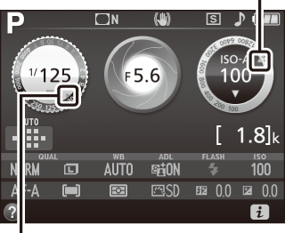 Når Til er valgt, viser søgeren ISO AUTO, og informationsvisningen viser ISO-A. Disse indikatorer blinker, når følsomheden ændres fra den brugervalgte værdi.