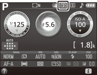 Vælg flashindstillingen for den indbyggede flash i indstillingerne P, S, A og M. Når den ekstra flashenhed SB-500, SB-400 eller SB-300 er monteret og tændt, skifter denne indstilling til Ekstra flash og anvende til at vælge flashindstilling for den ekstra flashenhed (0 Kompatible flashenheder).