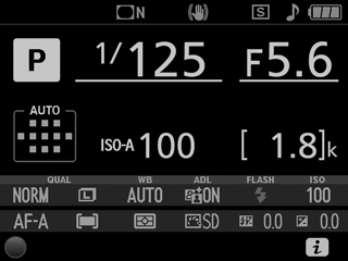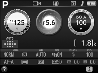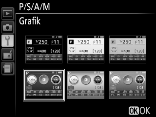Vælg et layout for informationsvisning (0 Søgerfotografering). Formaterne kan vælges særskilt for auto, motivtype og specialeffekt-indstillinger samt for indstillingerne P, S, A og M.
