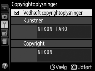 For at hindre uautoriseret brug af kunstnerens eller copyrightindehaverens navn skal du sørge for, at Vedhæft copyrightoplysninger ikke er valgt, og at felterne Kunstner og Copyright er tomme før udlån eller overdragelse af kameraet til en anden person. Nikon påtager sig intet ansvar for skader eller uenigheder, der måtte udspringe af indstillingen Copyrightoplysninger.
