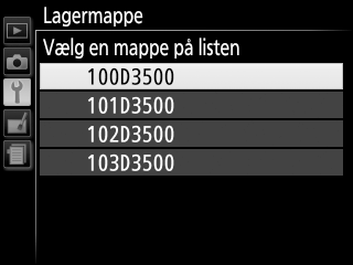 Vælg den markerede mappe. Tryk på J for at vælge den markerede mappe og vende tilbage til hovedmenuen. De efterfølgende billeder gemmes i den valgte mappe.