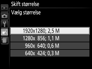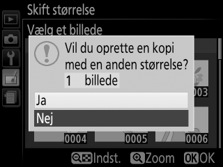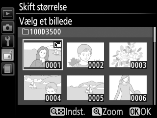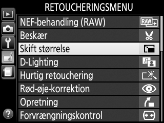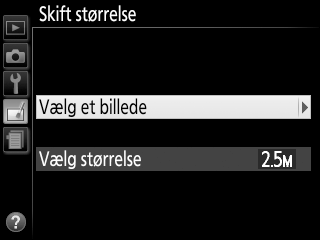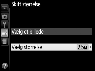 Vælg Skift størrelse. For at skifte størrelse på valgte billeder skal du markere Skift størrelse i retoucheringsmenuen og trykke på 2.