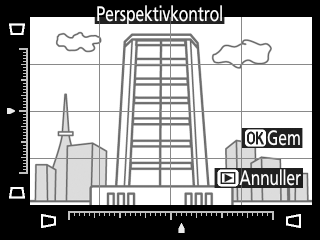 Opret kopier, som reducerer perspektiveffekterne for billeder taget nedefra af et højt motiv. Anvend multivælgeren til at tilpasse perspektivet (bemærk, at flittigere brug af perspektivkontrol medfører afskæring af flere kanter). Tryk på J for at gemme den retoucherede kopi.