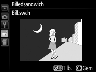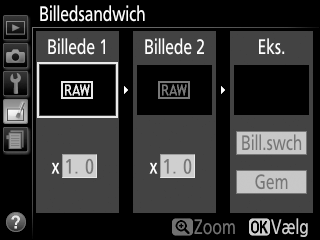 Billedsandwich kombinerer to eksisterende NEF (RAW)-billeder for at oprette et enkelt billede, der gemmes separat fra originalerne; resultaterne, der gør brug af RAW-data fra kameraets billedsensor, er markant bedre end billedsandwiches, der er oprettet i billedprogrammer. Det nye billede gemmes ved de aktuelle indstillinger for billedkvalitet og -størrelse; før oprettelse af en billedsandwich skal du indstille billedkvalitet og -størrelse (0 Billedkvalitet, Billedstørrelse; alle indstillinger er tilgængelige). Du kan oprette en NEF (RAW)-kopi ved at vælge billedkvaliteten NEF (RAW).