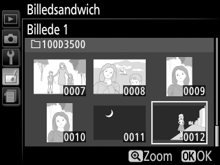 Vælg Billedsandwich. Markér Billedsandwich i retoucheringsmenuen, og tryk på 2. Indstillingerne for billedsandwich vises. Med Billede 1 markeret skal du trykke på J for at få vist en liste over NEF-billeder (RAW) oprettet med dette kamera.