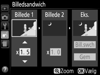 Justér forøgelse. Markér Billede 1 eller Billede 2, og optimér eksponeringen for billedsandwichen ved at trykke på 1 eller 3 for at vælge forøgelsen blandt værdier fra 0,1 til 2,0. Gentag proceduren for det andet billede. Standardværdien er 1,0; vælg 0,5 for at halvere forøgelsen eller 2,0 for at fordoble den. Effekterne af forøgelsen ses i kolonnen Eks.