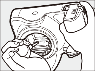 Oplad batteriet, eller tilslut en lysnetadapter. Der skal anvendes en pålidelig strømkilde ved eftersyn eller rengøring af billedsensoren. Sluk kameraet, og isæt et fuldt opladet batteri, eller tilslut en ekstra lysnetadapter og et stik til lysnetadapter. Indstillingen Lås spejl i hævet pos. ved rens er kun tilgængelig i opsætningsmenuen, hvis kameraet ikke er tilsluttet til en smartenhed via Bluetooth, og batteriniveauet ligger over H.