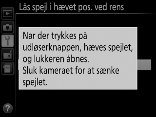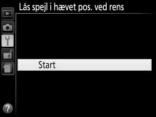 Vælg Lås spejl i hævet pos. ved rens. Tænd kameraet, markér Lås spejl i hævet pos. ved rens i opsætningsmenuen, og tryk på 2.