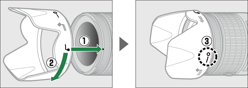HB-N106 Bajonetblænde Få monteringsmærket for modlysblænde på objektivet (●) til at flugte med justeringsmærket på modlysblænden (  ) som vist i Figur q, og drej derefter modlysblænden (w), til mærket ● flugter med låsemærket på modlysblænden (—○). ) som vist i Figur q, og drej derefter modlysblænden (w), til mærket ● flugter med låsemærket på modlysblænden (—○). Ved montering eller fjernelse af modlysblænden skal du holde fat i den tæt ved symbolet i bunden af den, uden at dit greb bliver for krampagtigt. Der kan forekomme vignettering, hvis modlysblænden ikke er monteret korrekt. Du kan vende modlysblænden om og sætte den på objektivet, når den ikke anvendes.