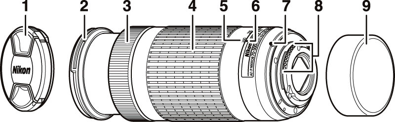 Læs dette afsnit, hvis du købte kameraet sammen med AF-P DX NIKKOR 70–300mm f/4.5–6.3G ED VR- eller AF-P DX NIKKOR 70–300mm f/4.5–6.3G ED-objektivsættet, der er tilgængeligt i visse lande eller områder. Objektivets dele er opstillet herunder.