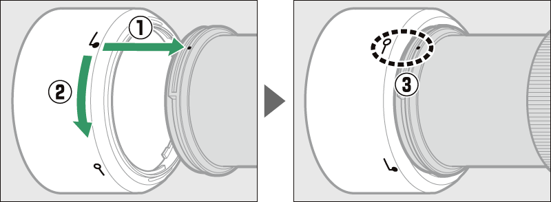 HB-77 Bajonetblænde Få monteringsmærket for modlysblænde på objektivet (●) til at flugte med justeringsmærket på modlysblænden (  ) som vist i Figur q, og drej derefter modlysblænden (w), til mærket ● flugter med låsemærket på modlysblænden (—○). ) som vist i Figur q, og drej derefter modlysblænden (w), til mærket ● flugter med låsemærket på modlysblænden (—○). Ved montering eller fjernelse af modlysblænden skal du holde fat i den tæt ved symbolet i bunden af den, uden at dit greb bliver for krampagtigt. Der kan forekomme vignettering, hvis modlysblænden ikke er monteret korrekt. Du kan vende modlysblænden om og sætte den på objektivet, når den ikke anvendes. Når modlysblænden vendes om, kan den monteres og fjernes ved, at du drejer den, mens du holder den tæt ved låsemærket (—○).