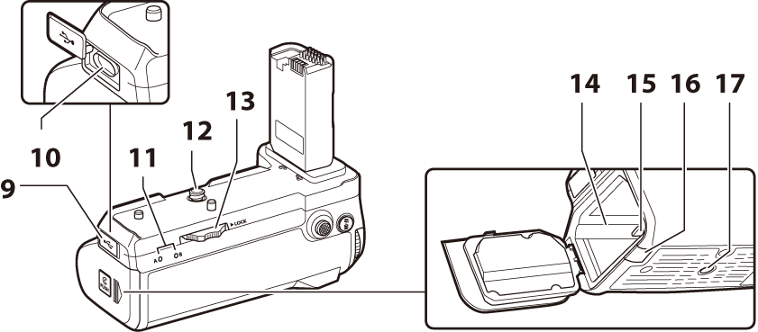 | 24 | Akkumulátor csatlakozók (×2) | „Akkumulátorok behelyezése az MB-N11 ” ( 0 Elemek behelyezése az MB-N11 ). |