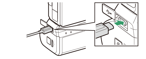 - Baterai tidak akan mengisi daya jika kabelnya disambungkan ke konektor USB kamera sementara MB-N11 dipasang. Sambungkan kabelnya ke konektor pengisi daya MB-N11.