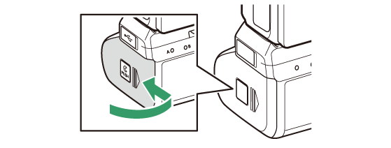 MB-N11は、Li-ionリチャージャブルバッテリーEN‑EL15c(最大2個)を使用します。バッテリーを入れる前に、カメラの電源をOFFにしてください。また、バッテリー交換中の誤操作を防ぐため、交換が完了するまでMB-N11のロックレバーをL(ロック)側にセットしてください。