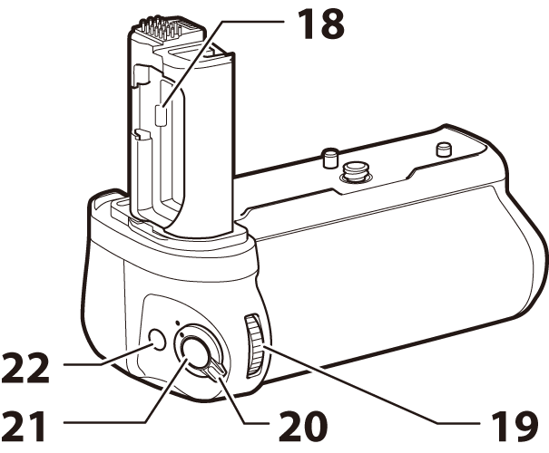| 22 | Fn mygtukas vertikaliam fotografavimui | Atlieka funkciją, priskirtą Fn mygtukui fotografuojant vertikaliai. Vaidmenis galima pasirinkti kameros meniu. Išsamesnės informacijos ieškokite su fotoaparatu pateiktoje dokumentacijoje. |