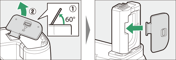 Nuimkite akumuliatoriaus skyriaus dangtelį nuo fotoaparato apačios ir įdėkite jį į MB-N11 akumuliatoriaus skyriaus dangtelio laikiklį.
