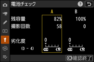 Дополнительную информацию, включая возраст батареи и точный уровень заряда батареи, можно просмотреть с помощью пункта [ Информация о батарее ] в меню настроек камеры.
