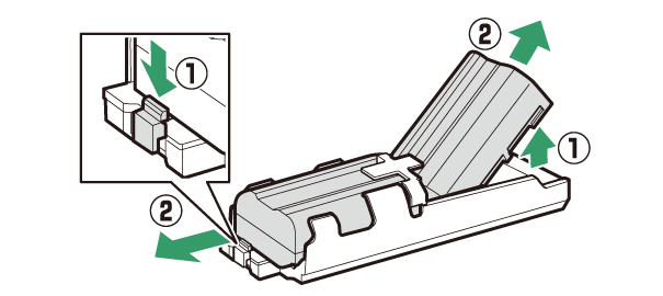 Stäng hållarkammarens lock och spärra det genom att trycka och skjuta det i den riktning som visas.