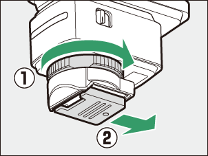 Ak chcete vybrať ME-D10, vypnite fotoaparát a uvoľnite poistný krúžok jeho otočením v opačnom smere, ako bol použitý na jeho upevnenie.