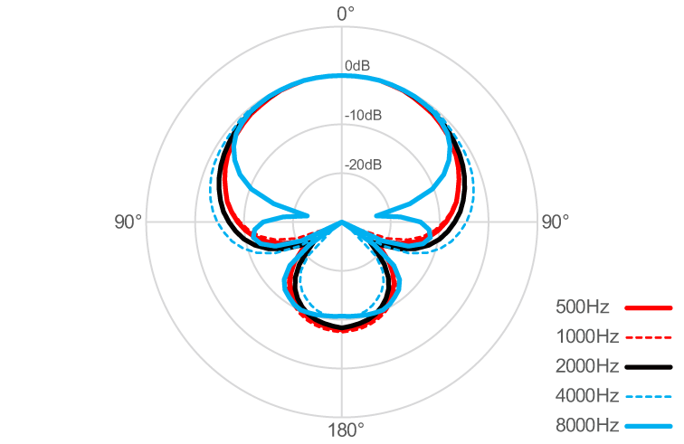 频响和指向性根据麦克风模式和拾音方向设定的不同而异。