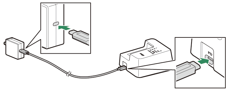 Collegare l'adattatore CA/caricabatteria EH-7P o il cavo USB (con connettori Type-C a entrambe le estremità) collegato all'adattatore CA EH-8P al caricabatteria.