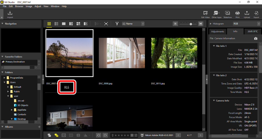 Prohlížení fotografií HLG v NX Studio