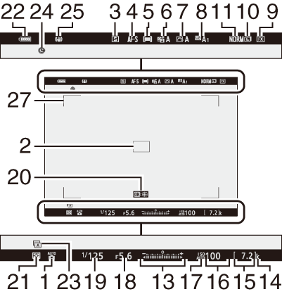 При настройките по подразбиране на монитора и визьора се появяват следните индикатори; за пълен списък с индикатори вижте „Дисплеи на камерата“ ( Дисплеи на камерата ) в „Технически бележки“.