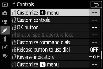 Елементите, за които камерата показва екранно ръководство, могат да се регулират, като ги маркирате в менюто i и завъртите диска за управление. В някои случаи корекциите могат да бъдат направени с помощта както на главния, така и на подкомандния диск.