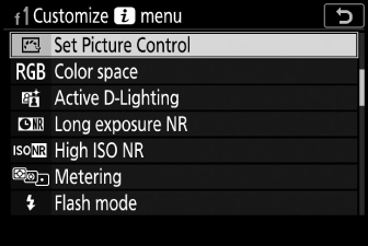 Елементите, показани в менюто i на фоторежим, могат да бъдат избрани с помощта на персонализирана настройка f1 или g1 [ ].