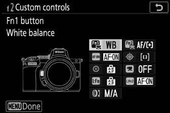 По подразбиране на бутона Fn1 е присвоен баланс на бялото ( Баланс на бялото ), а на бутона Fn2 за избор на режим на фокусиране и AF зона ( Фокус ).