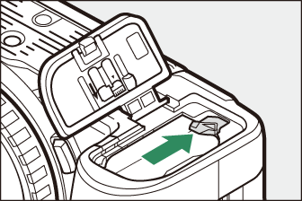 За да извадите батерията, изключете фотоапарата и отворете капака на камерата за батерията. Натиснете фиксатора на батерията в посоката, показана от стрелката, за да освободите батерията и след това извадете батерията на ръка.