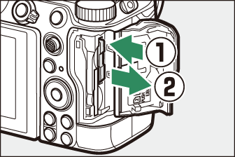 След като се уверите, че лампичката за достъп до картата с памет е изключена, изключете фотоапарата, отворете капака на слота за карта с памет и натиснете картата, за да я извадите ( q ). След това картата може да бъде извадена на ръка ( w ).