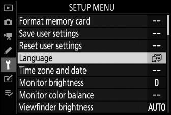 Натиснете 1 или 3 , за да маркирате желания език и натиснете J (наличните езици варират в зависимост от страната или региона, в който фотоапаратът е закупен първоначално).
