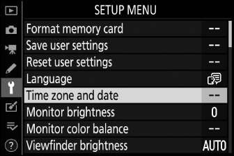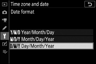 Натиснете J , след като използвате мултиселектора, за да настроите часовника на датата и часа в избраната часова зона (имайте предвид, че фотоапаратът използва 24-часов часовник).