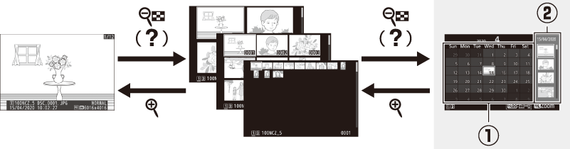 Използвайте мултиселектора ( 1 , 3 , 4 или 2 ), за да маркирате дата в списъка с дати ( q ) и натиснете W ( Q ), за да поставите курсора в списъка с миниатюри ( w ). Натиснете 1 или 3 , за да маркирате снимки в списъка с миниатюри. За да се върнете към списъка с дати, натиснете бутона W ( Q ) втори път.