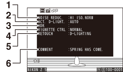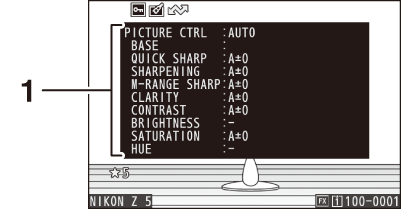 Показаните елементи варират в зависимост от Picture Control, който е в сила, когато е направена снимката.