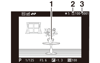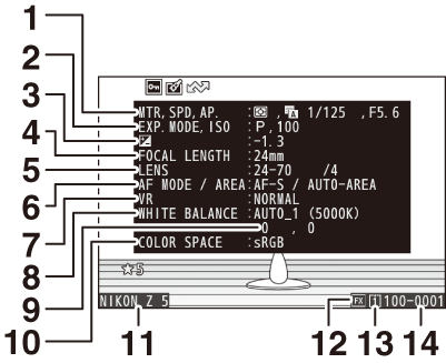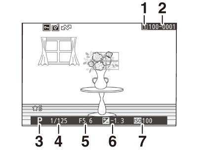 Вижте настройките, които са в сила към момента на заснемане на снимката. Списъкът с данни за снимане има няколко страници, които могат да бъдат прегледани чрез натискане на 1 или 3 .