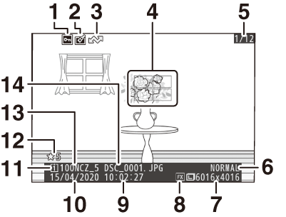 Информацията за снимката се наслагва върху изображенията, показани при възпроизвеждане на цял кадър. Натиснете 1 , 3 или бутона DISP , за да преминете през информацията за снимката, както е показано по-долу.