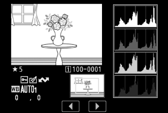 За да увеличите изображението в дисплея на хистограмата, натиснете X . Хистограмата ще бъде актуализирана, за да покаже само данните за частта от изображението, видима на дисплея. Използвайте мултиселектора, за да превъртите до области от рамката, които не се виждат на монитора. Натиснете W ( Q ), за да намалите мащаба.