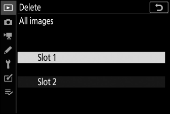 Натиснете 1 или 3 , за да маркирате слота, съдържащ картата с памет, от която ще бъдат изтрити снимките и натиснете J