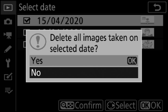 Маркирайте [ ] и натиснете J , за да изтриете всички снимки, направени на избраните дати.