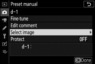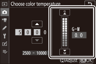 Избраната предварителна настройка може да бъде фино настроена, като изберете [ ] в менюто за предварително зададен ръчен баланс на бялото ( The White Balance Menu: Fine-Tuning ).
